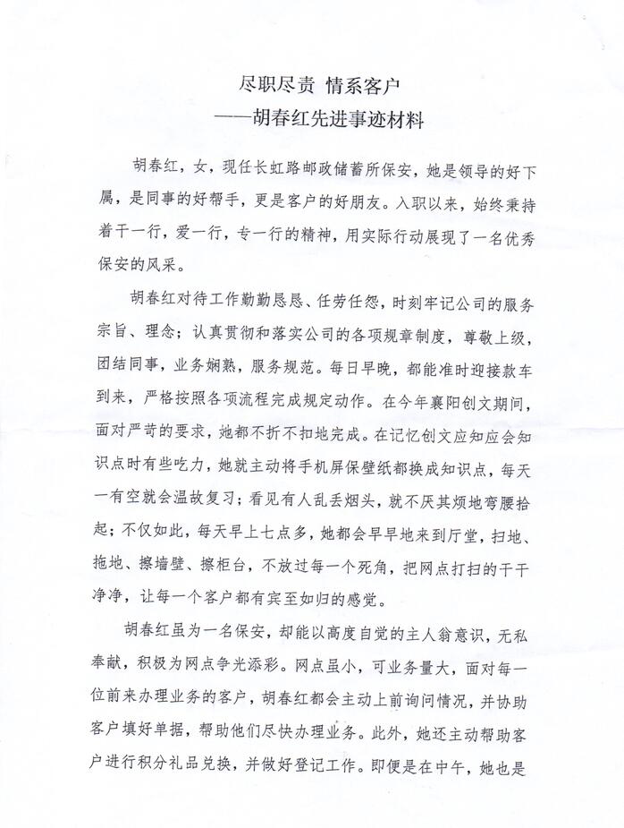 胡春紅,女,現(xiàn)任長(zhǎng)虹路郵政儲(chǔ)蓄所保安,她是領(lǐng)導(dǎo)的好下屬,是同事的好幫手,更是客戶的好朋友。入職以來(lái),始終秉持著干一行,愛(ài)一行,專一行的精神,用實(shí)際行動(dòng)展現(xiàn)了一名優(yōu)秀保安的風(fēng)采。胡春紅對(duì)待工作勤勤懇懇、任勞任怨,時(shí)刻牢記公司的服務(wù)宗旨、理念;認(rèn)真貫徹和落實(shí)公司的各項(xiàng)規(guī)章制度,尊敬上級(jí),團(tuán)結(jié)同事,業(yè)務(wù)嫻熟,服務(wù)規(guī)范。每日早晚,都能準(zhǔn)時(shí)迎接款車(chē)到來(lái),嚴(yán)格按照各項(xiàng)流程完成規(guī)定動(dòng)作。在今年襄陽(yáng)創(chuàng)文期間,面對(duì)嚴(yán)苛的要求,地都不折不扣地完成。在記憶創(chuàng)文應(yīng)知應(yīng)會(huì)知識(shí)點(diǎn)時(shí)有些吃力,她就主動(dòng)將手機(jī)屏保壁紙都換成知識(shí)點(diǎn),每天有空就會(huì)溫故復(fù)習(xí):看見(jiàn)有人亂丟煙頭,就不厭其煩地彎腰拾起;不僅如此,每天早上七點(diǎn)多,她都會(huì)早早地來(lái)到廳堂,掃地拖地、擦墻壁、擦柜臺(tái),不放過(guò)每一個(gè)死角,把網(wǎng)點(diǎn)打掃的干干凈凈,讓每一個(gè)客戶都有賓至如歸的感覺(jué)。胡春紅雖為一名保安,卻能以高度自覺(jué)的主人翁意識(shí),無(wú)私幸獻(xiàn),積極為網(wǎng)點(diǎn)爭(zhēng)光添彩。網(wǎng)點(diǎn)雖小,可業(yè)務(wù)量大,面對(duì)每位前來(lái)辦理業(yè)務(wù)的客戶,胡春紅都會(huì)主動(dòng)上前詢問(wèn)情況,并協(xié)助客戶填好單據(jù),幫助他們盡快辦理業(yè)務(wù)。此外,她還主動(dòng)幫助客戶進(jìn)行積分禮品兌換,并做好登記工作。即便是在中午,她也是匆忙吃過(guò)飯后,主動(dòng)放棄午休,繼續(xù)投入到工作中。由于網(wǎng)點(diǎn)只能辦理金融業(yè)務(wù),有些客戶不知情,進(jìn)店詢問(wèn)郵務(wù)類(lèi)業(yè)務(wù),甚至只是嚼水、問(wèn)路,胡春紅都會(huì)熱情迎客,耐心解答,做到知無(wú)不言,言無(wú)不盡視客戶如親人,這是胡春紅一直堅(jiān)持的信念,對(duì)待每位客戶胡春紅都做到了來(lái)有迎聲,走有送聲,不僅如此,她還想客戶之所想,急客戶之所急她所在的網(wǎng)點(diǎn)有兩位特殊的客戶,由于偏癱,每月都必須由年邁的母親騎著三輪車(chē)帶女幾來(lái)領(lǐng)低保,母親沒(méi)有什么文化,也不會(huì)寫(xiě)字,每次母女兩剛到門(mén)口,胡春紅都會(huì)馬上迎出門(mén)去,攙扶客戶進(jìn)店,幫助客戶填單,同時(shí)還會(huì)噓寒問(wèn)暖,問(wèn)問(wèn)母女兩有沒(méi)有什么困難需要幫助。客戶十分感激,多次提出送點(diǎn)禮物給胡春紅,也都被她一一謝絕了。