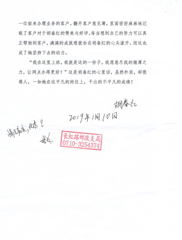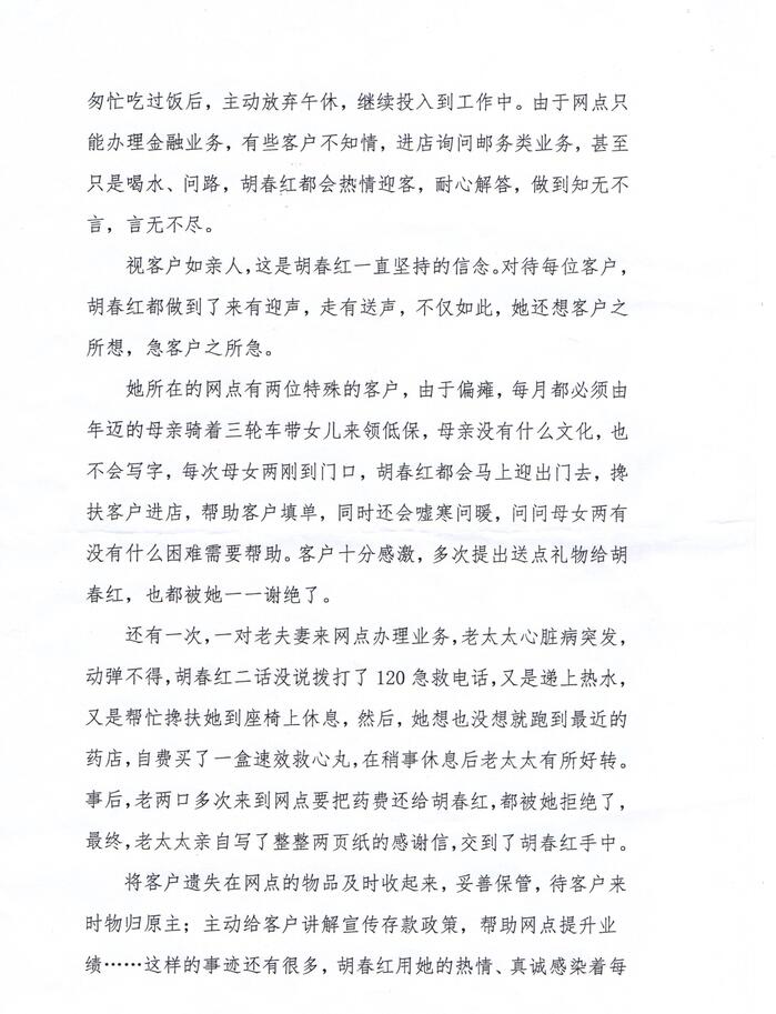 還有一次,一對(duì)老夫妻來(lái)網(wǎng)點(diǎn)辦理業(yè)務(wù),老大大心臟病突發(fā),動(dòng)彈不得,胡春紅二話沒(méi)說(shuō)撥打了120急救電話,又是遞上熱水又是幫忙攙扶她到座椅上休息,然后,她想也沒(méi)想就跑到最近的藥店,自費(fèi)買(mǎi)了一盒速效救心丸,在稍事休息后老太大有所好轉(zhuǎn)事后,老兩口多次來(lái)到網(wǎng)點(diǎn)要把藥費(fèi)還給胡春紅,都被她拒絕了,最終,老大大親自寫(xiě)了整整兩頁(yè)紙的感謝信,交到了胡春紅手中。將客戶遺失在網(wǎng)點(diǎn)的物品及時(shí)收起來(lái),妥善保管,待客戶來(lái)時(shí)物歸原主;主動(dòng)給客戶講解宣傳存款政策,幫助網(wǎng)點(diǎn)提升業(yè)績(jī)……這樣的事跡還有很多,胡春紅用她的熱情、真誠(chéng)感染著每一位前來(lái)辦理業(yè)務(wù)的客戶。翻開(kāi)客戶意見(jiàn)薄,里面密密麻麻地記載了客戶對(duì)于胡春紅的贊美與好評(píng),每當(dāng)想到自已的努力可以真正幫助到客戶,滿滿的成就感就會(huì)在胡春紅的心頭漾開(kāi),而這也成了她堅(jiān)持下去的動(dòng)力。“我在這里上班,我就是這的一份子,我愿意盡我的微薄之力,讓網(wǎng)點(diǎn)辦得更好!”這是胡春紅的心里話,雖然樸實(shí),卻很感人,一如她在這平凡的崗位上,干出的不平凡的成績(jī)!